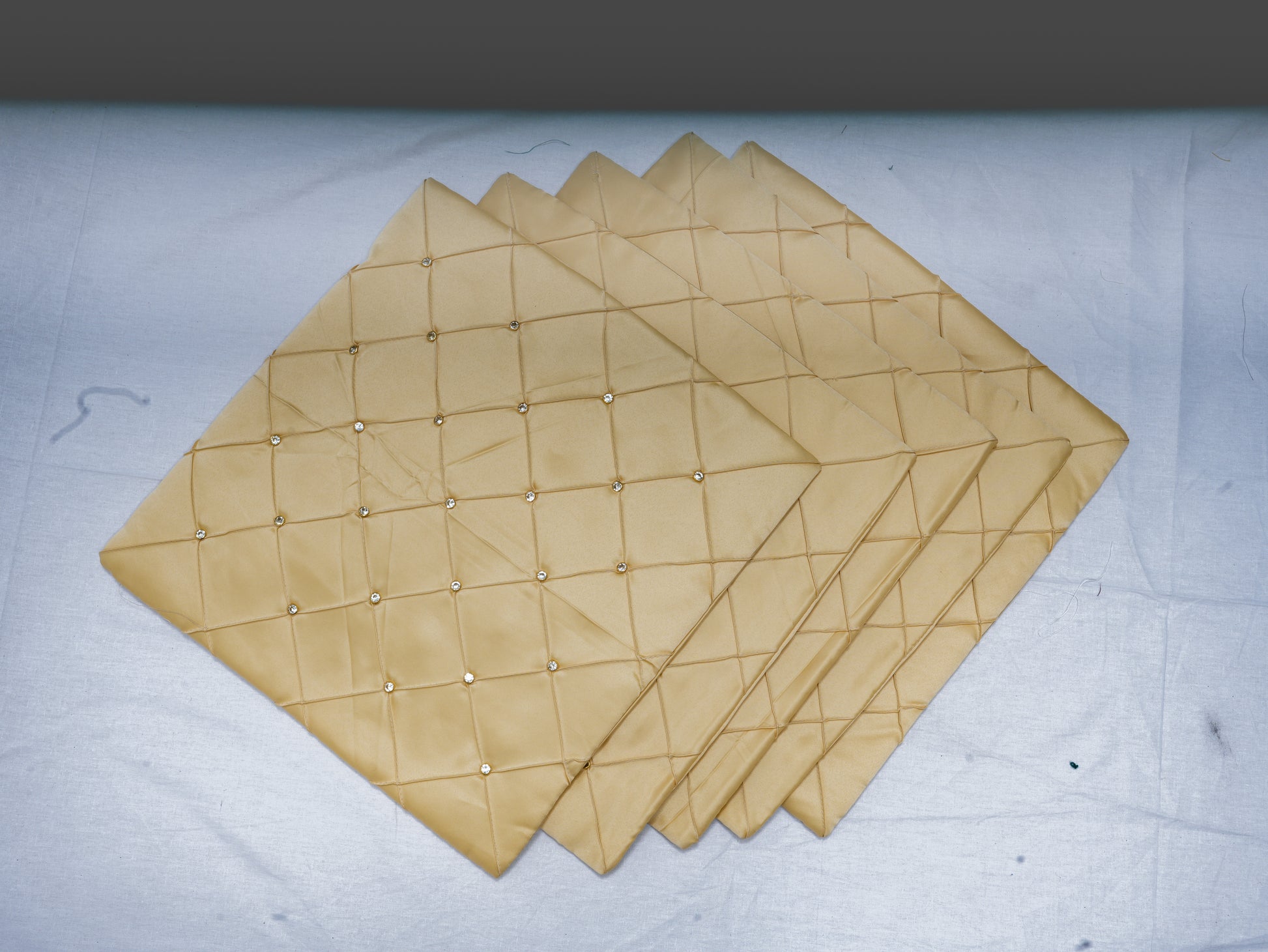 Add a royal touch to your living space with this set of 5 luxurious satin pillow covers. Designed in a rich golden shade with a quilted diamond pattern, each cushion cover is enhanced with sparkling stone studs, bringing a glamorous and sophisticated vibe to your home décor.