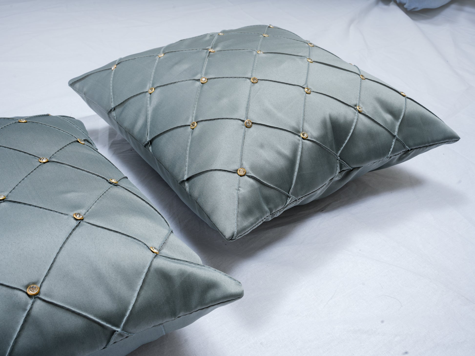 Add a luxurious touch to your home décor with our Elegant Diamond-Studded Grey Cushion Covers. Designed in a sophisticated quilted diamond pattern and embellished with delicate stud accents, these cushion covers bring glamour and elegance to any living space.