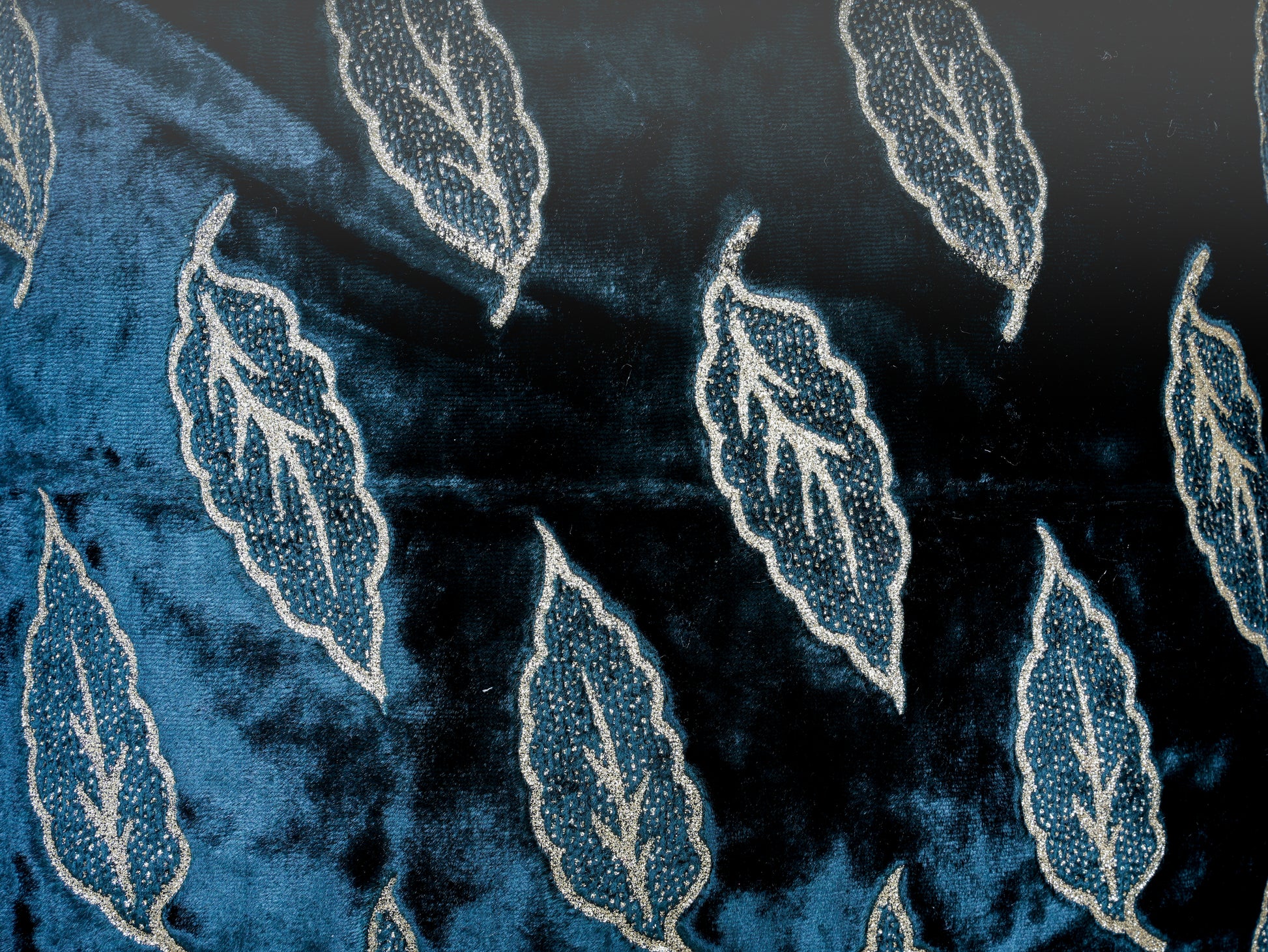 Design: Golden embroidered leaf pattern on deep blue velvet for a striking effect